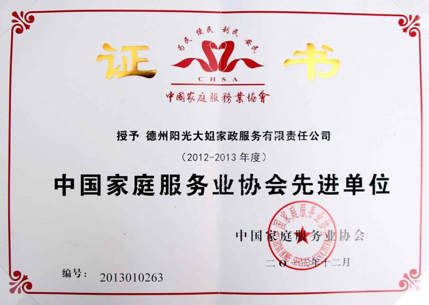 公司榮獲中國家庭服務(wù)業(yè)協(xié)會(huì)先進(jìn)單位稱號(hào)