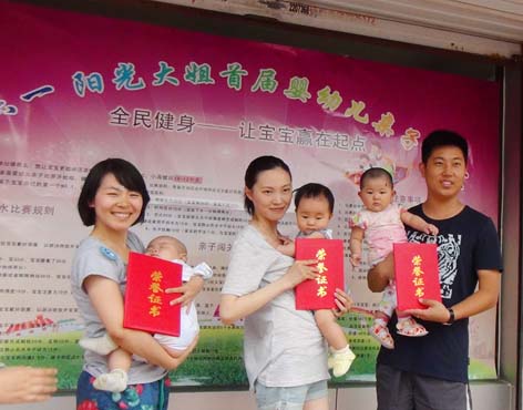 ? ? 全民健身從寶寶做起。為了讓更多媽媽了解嬰幼兒游泳的益處,更好地推廣嬰幼兒益智開發(fā)游泳。6月1日,陽光大姐首屆嬰幼兒親子比賽在我公司水育中心舉行, 50余名寶寶分四組賽齡參加了游泳比賽和親子闖關(guān)比賽,共評出一二三等獎各四名。本次比賽得到了寶寶及家長們的積極參與。獲獎寶寶還得到了人生第一本證書和豐厚的獎品。